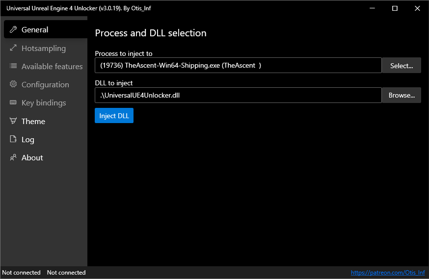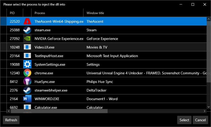 - Select TheAscent-Win64-Shipping.exe and click Inject DLL