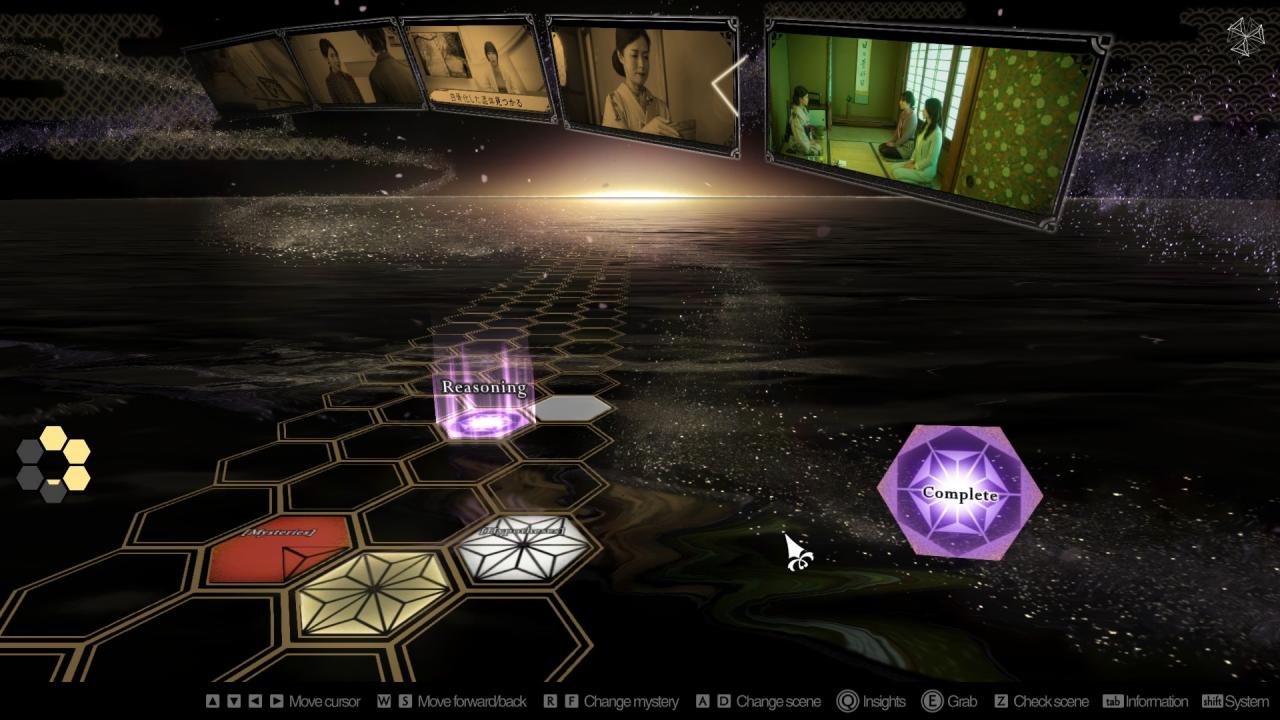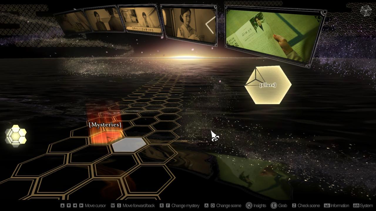 - These gray hexagons are filled in with yellow hexagons that are obtained from cycling through videos shown in the upper-right part of the screen. These represent scenes relevant to the investigation, and any clues obtained from the scene will be included with the scene. If you want more context, you can watch the scene by pressing check scene and then play scene once it is in check mode.
