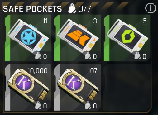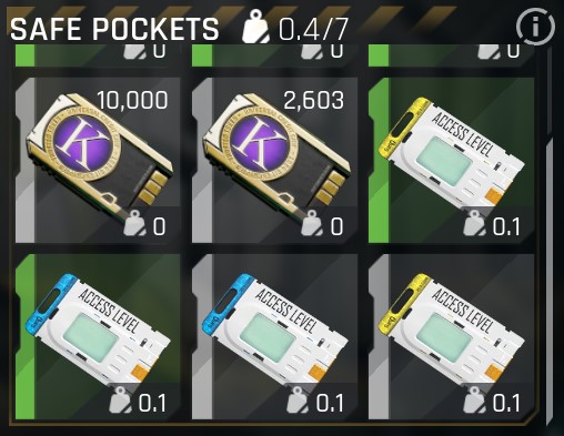 Now, the last things you should store in your safe pockets, are key cards. These items are a bit different, because they weigh 0.1… weight… units… each, meaning that you will be able to store slightly less in your safe pockets. For example, Radio Equipment weighs 7 units. With a pocket capacity of 7, and at least one key card, the radio equipment will not fit. It’s unfortunate, but if you’re desperate, it will free up slots in your stash.