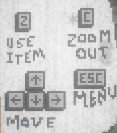 Basic controls: ↑(Up), ↓(Down), ←(Left), →(Right)  ,C(Zoom out),Z(Use item),ESC(Menu)