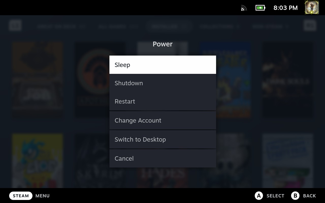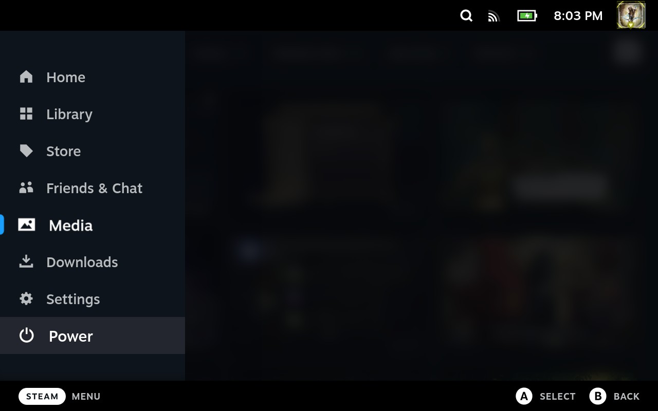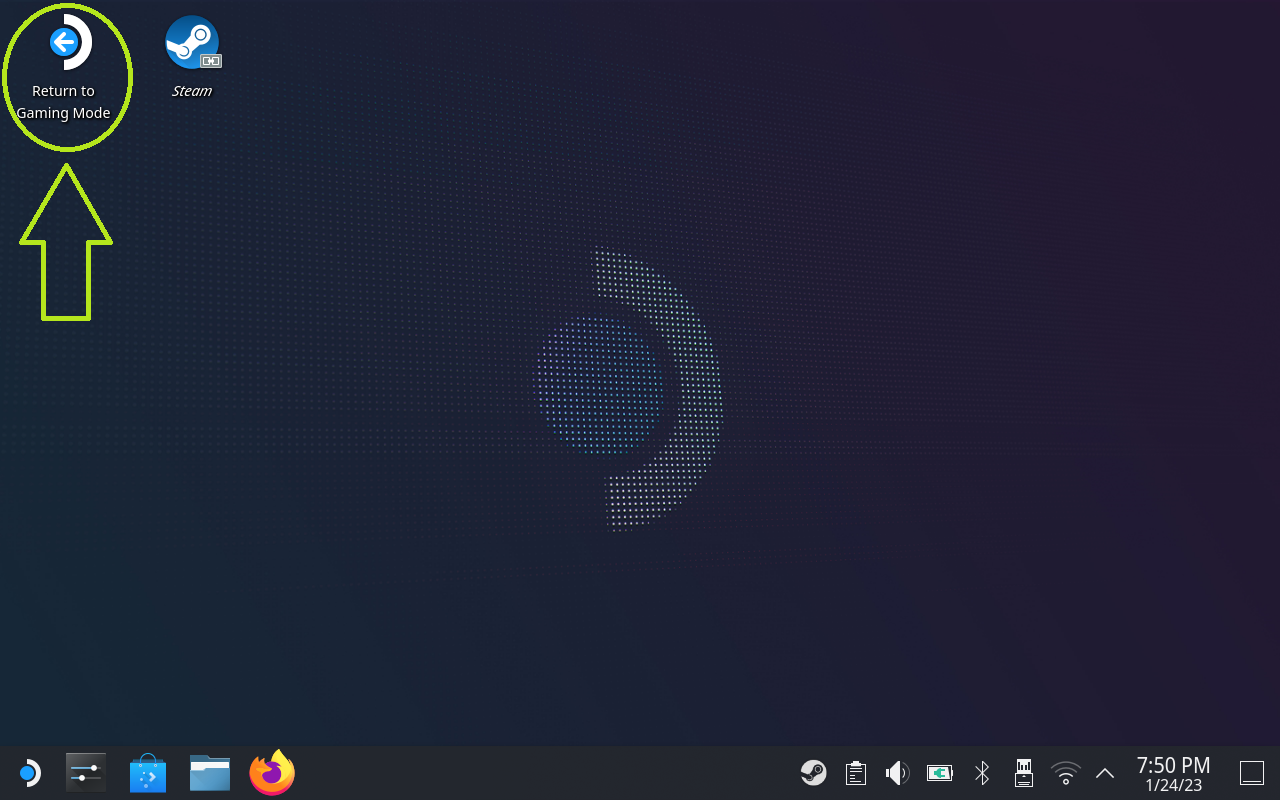 First, press the physical STEAM button on the left of the device, next to the screen. Select Power from the popup menu, then select Switch to Desktop.