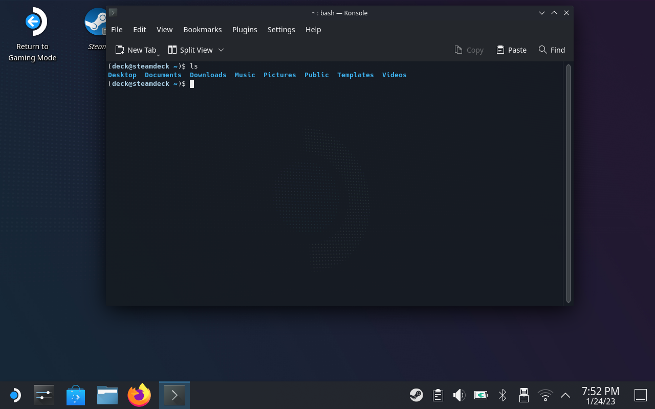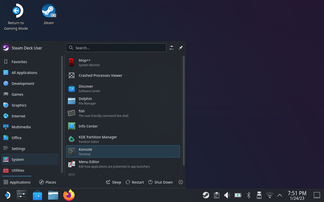 Navigate to System > Konsole, which will bring up the Konsole window. This is a standard command-line interface, like Terminal on Mac or Command Prompt on Windows.