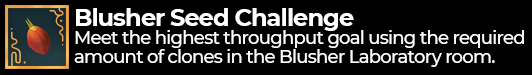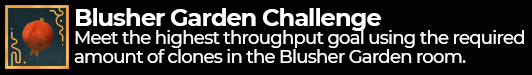 For Blusher Garden Challenge, each clone can throw 1 fruit per interval if the timer is set to one. The clones should be throwing the fruits as fast as they grow. Make the clones throw directly into the input basket. Skip the nearest fruit growing pod and work your way back until you approach the goal (I think 5 or 6 clones?) When you are close, you can manually throw fruit from the nearest pod. Alternatively, if you have a hard time getting further clones to make their throws, you can play clean up near the basket to make sure the fruits get in