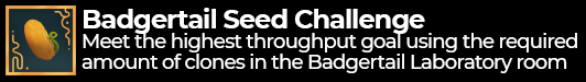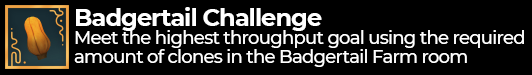 For this have 1 clone in the middle of each of the 4 growing pods (straight down the middle of the room). Have the first clone holding the knife cut each Badgertail in a circle, finishing by throwing the knife to the other clone in the middle of the other 4 growing pods. BEFORE you let go of this first clone, have it stand with it’s hand ready to catch the knife again until the timer runs out. You will want to use a 4 timer on these two.