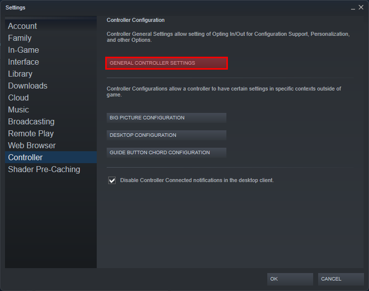 Once you have your Steam settings open, you want to look for the option on the left that says “Controller”. Click on that and then select “General Controller Settings”.