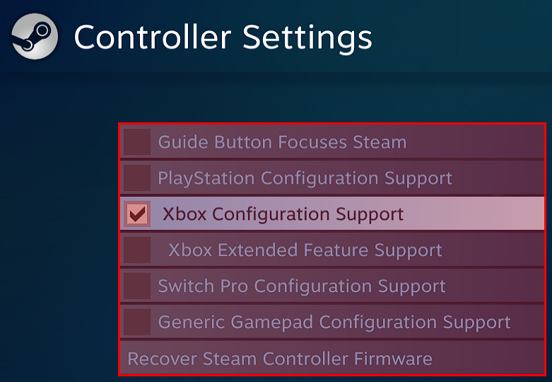 This should open another window where you are presented with some more options. For this part of the guide, you’re going to need to select the option which applies to your own controller. This means enabling “PlayStation Configuration Support” for a PlayStation controller, “Xbox Configuration Support” for an Xbox controller, “Switch Pro Configuration Support” for a Switch Pro Controller, or “Generic Gamepad Configuration Support” for any generic Bluetooth or wired controller.