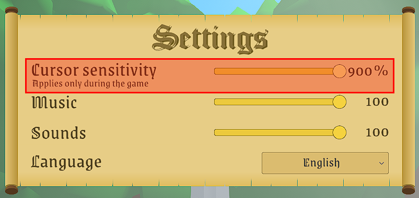 Once you have the game open, you’re going to want to open the settings. Turn “Cursor Sensitivity” all the way up (don’t worry, this won’t affect the speed of your mouse outside of gameplay).