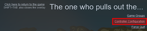 Next, pull up the Steam overlay (this is set to Shift + Tab by default). In the top right of the overlay – just below the name of the game – there should be three options. Click on “Controller Configuration”.