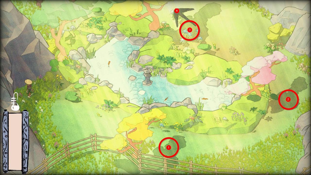 At the pond, before clicking the rest of the quest markers, click on the 3 fish. After you click the first one, small markers appear on the others.