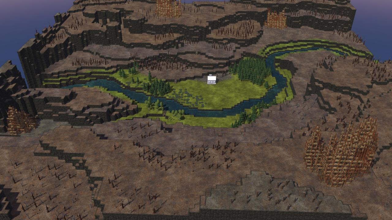 This is one of the biggest, a full size map. It could be played with a mix of terraforming and suspension bridge strategies. But, the hinterland is daunting and dry. Expect a big project here. This is a decent map for the Steel Teeth Faction.