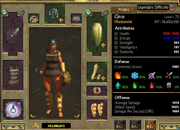 Using Touch of Nyx as main hand for extra resists, faster cast speed and lower energy cost. Another good alternative is Gorgon’s Edge. Neither are particularly rare, throwing weapons drop frequently, so shouldn’t be hard to find one or the other really. Using Soldier’s Unyielding Will as my shield for it’s large DA buff.