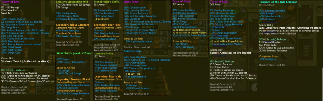 Stonebinder’s Cuffs for +3 skill. Ismene’s Helm for it’s poison damage buff. Discs of Mani is a favourite of mine, tons of resists, good armour, energy, speed, +2 Nature and Strength of the Pack and pet health / speed buff while also only requiring fairly minimal Strength to equip. Torso of Loki for resists, +2 Rogue, dodge, speed and resists. It’s also been upgraded with normal craftsman upgrade.