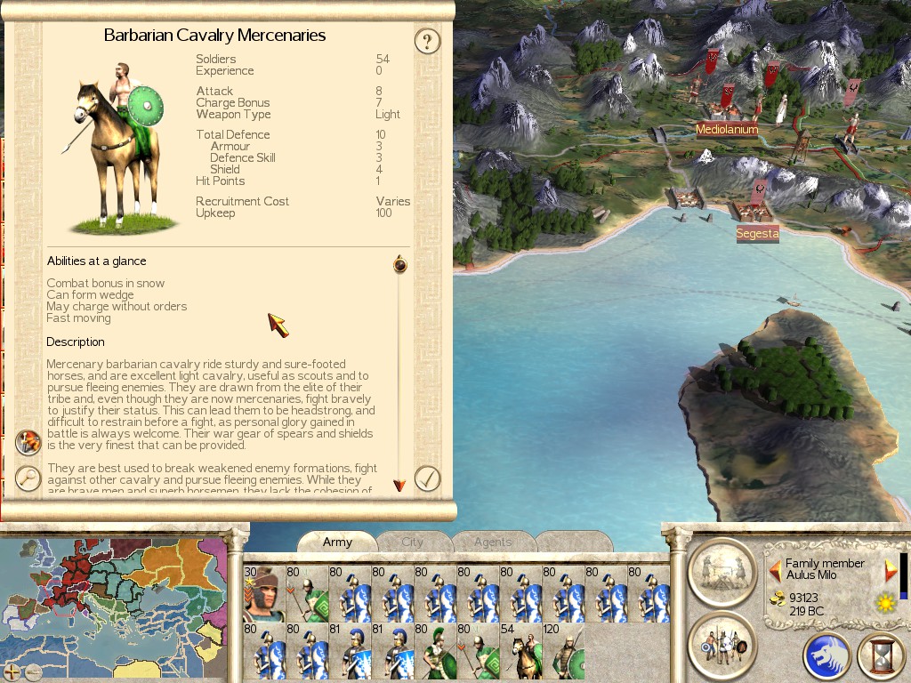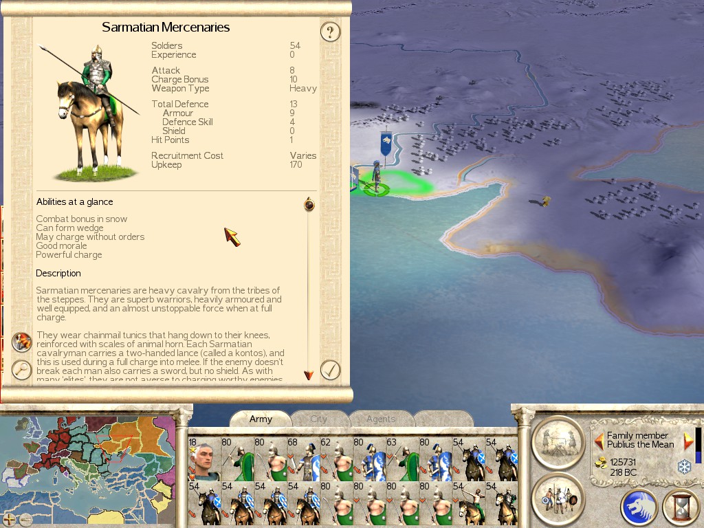 Description: Sarmatian’s are the only Heavy Cavalry Mercenary Unit in the game. Their attack is decent enough, but they also come with a 10 point charge bonus. Heavy Cavalry is always good to have, and these Mercenaries make very effective additions to your own.
