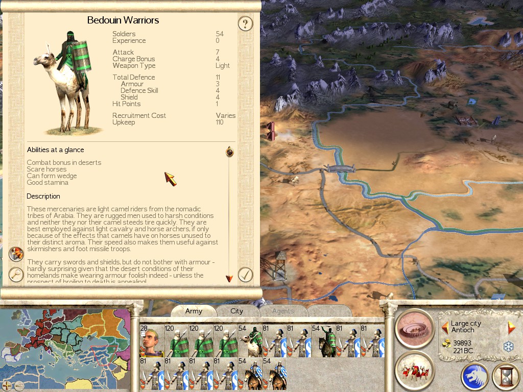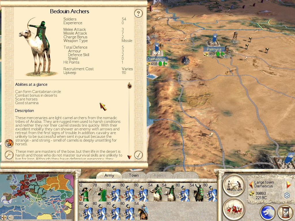 Description: Bedouin Archers are Camel Riders, and as such, have the passive ability to scare horses. Enemy Cavalry can lose morale around Camels, but these archers typically don’t get close enough for that to happen. Still, they are very effective Mounted Missile Cavalry, outclassed only by Scythian Mercenaries.