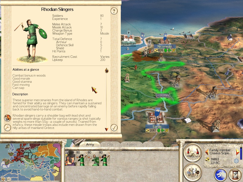 Description: I know, I was surprised too. Rhodian Slingers actually pack a solid punch, but lack any real range to use this effectively. That being said, they are excellent on Large Walls for Defensive Sieges.