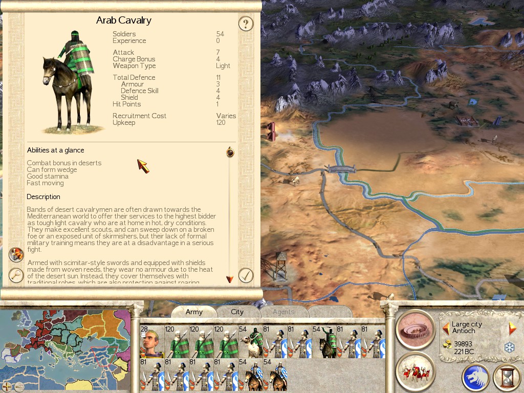 Description: These Mounted Horse Archers are the best Missile Cavalry Unit Rome can recruit. This might be the only Mercenary Unit you could viably make an entire army out of. Horse Archers can pick off your enemy at a distance, and are not easy to catch. Keep them out of range of enemy Cavalry, and they can be an excellent addition to your army.
