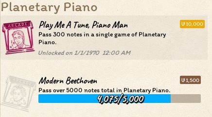 As shown in “Achievements for Planetary Piano” image, it took me around 4,000 clicks in order to successfully acquire this achievement. This gained me 10,000 Units for the “Play Me A Tune, Piano Man” achievement, plus 1,500 credits for the “Modern Beethoven” achievement shortly after. Totalling to 11,500 Units.