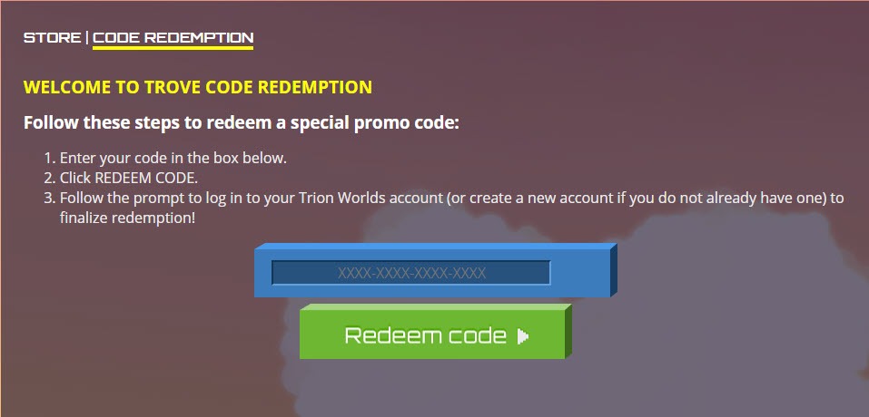 1) Go to the Official Trove Code Redemption page. https://www.trionworlds.com/trove/en/store/redeem/