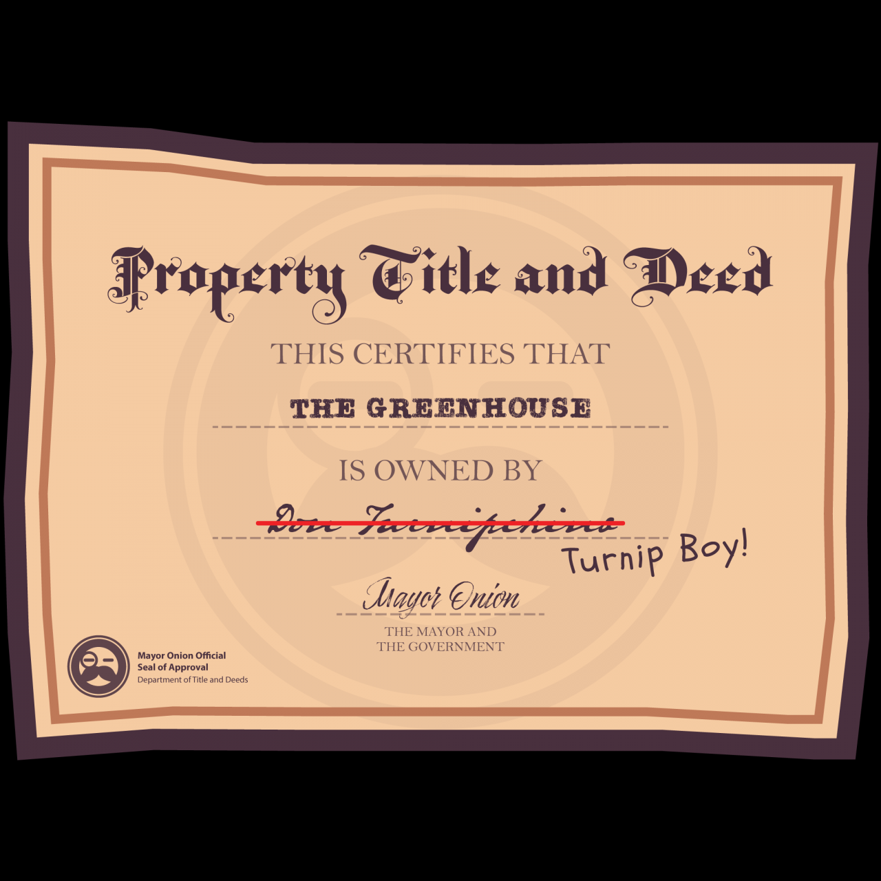 Find the deed to your greenhouse when you beat the game. (Any ending!)