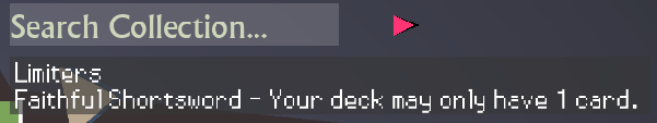 Select few cards have limiters attached to them. These add additional deckbuilding rules you must follow for a deck to be considered valid. For example, the starting card, the Faithful Shortsword, requires that it be the only card in your deck. Another example might be, “Your deck must contain 5 [Undead].”. If a card is too strong to be balanced by other means, it will have a limiter attached to it.