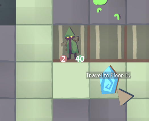 Your character has 2 attack and 40 life. You can walk into enemies to attack them, which will draw 1 card from your deck for you to use. All cards have 2 different effects based on where you played them: