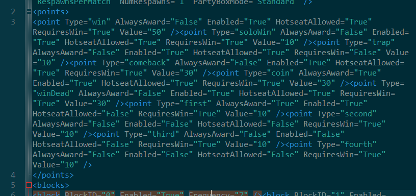 As for the other 2, I’m not entirely sure. HotseatAllowed is – by default – set to true for all types except First through Forth, and that led me to thinking it had played into how Solo overriding worked or something to do with Shared Controller Mode, but I found nothing. I was so sure RequiresWin meant what it says: this point type requires you to “win” that round. (E.g., if you deserve a trap point, you wouldn’t be rewarded with it if you didn’t also make it to the flag.) But my testing revealed otherwise. I had player 3 earn a trap point and then fail the round, but was granted the point anyway. I triple checked that Trap’s RequiresWin was changed to True.