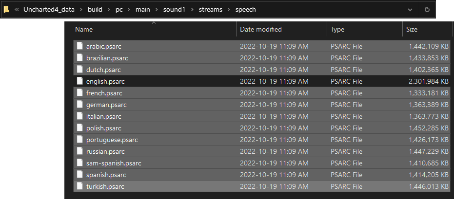 For example, if you will only be using the English audio, keep english.psarc in each folder, then delete the other files. If English is the only audio kept, the install size is reduced by 27 GB.