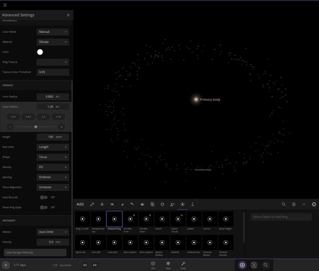 - Inner Radius: (set this to a radius slightly smaller than the radius of the secondary body’s orbit, 4/5 of the radius of the secondary body’s orbit typically works)
