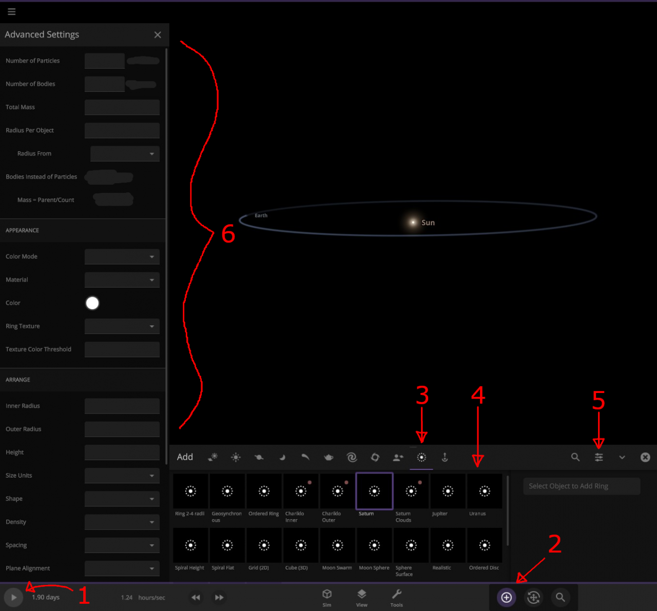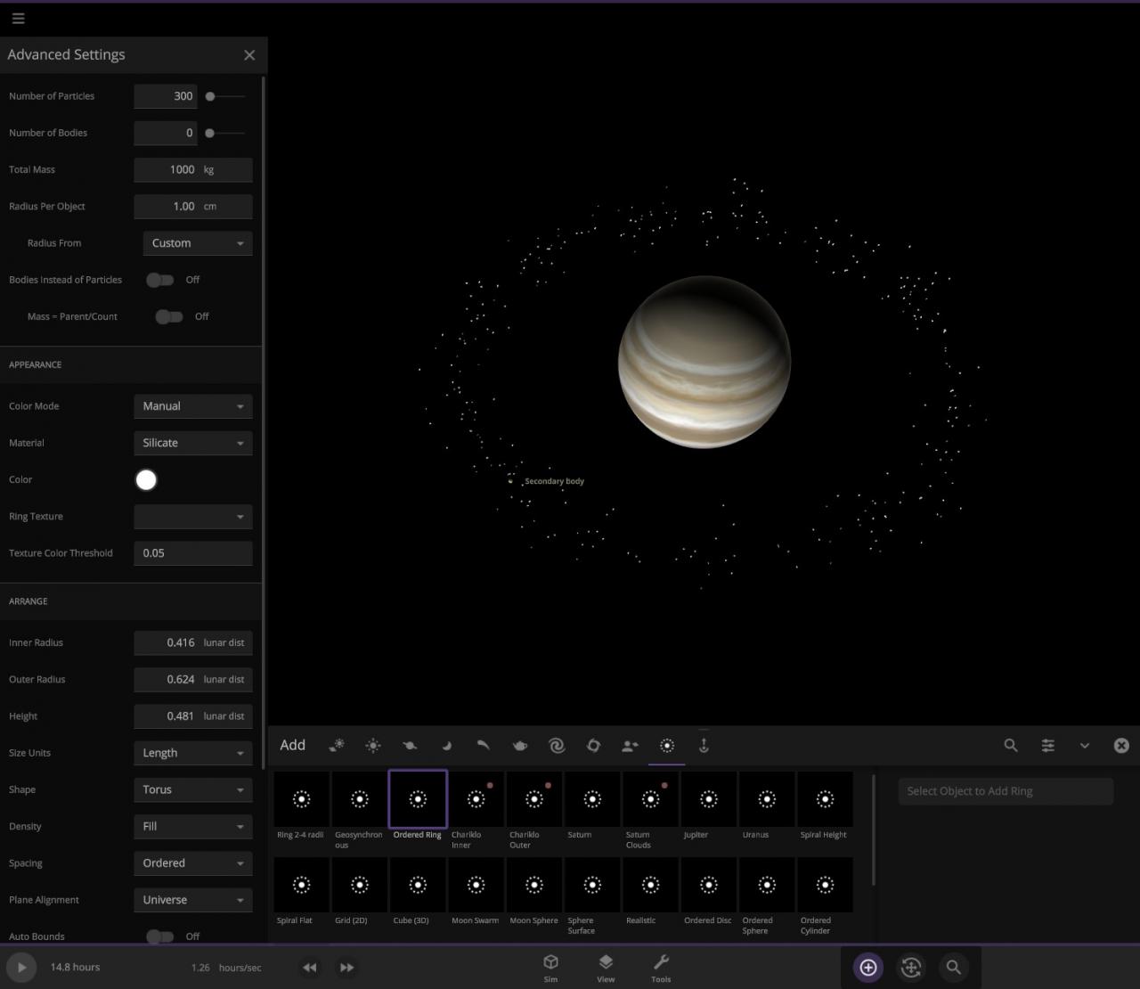 To place the ring, select the primary body and click the “Add Ring to ‘X‘” button (where X is the name of your primary body) near the bottom right corner. For a system with bodies relatively far from each other, your ring should look similar to