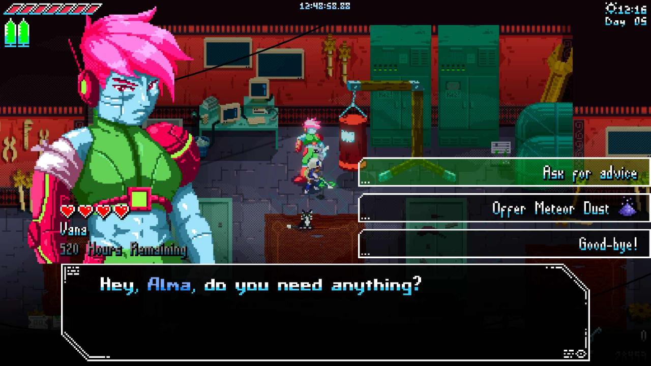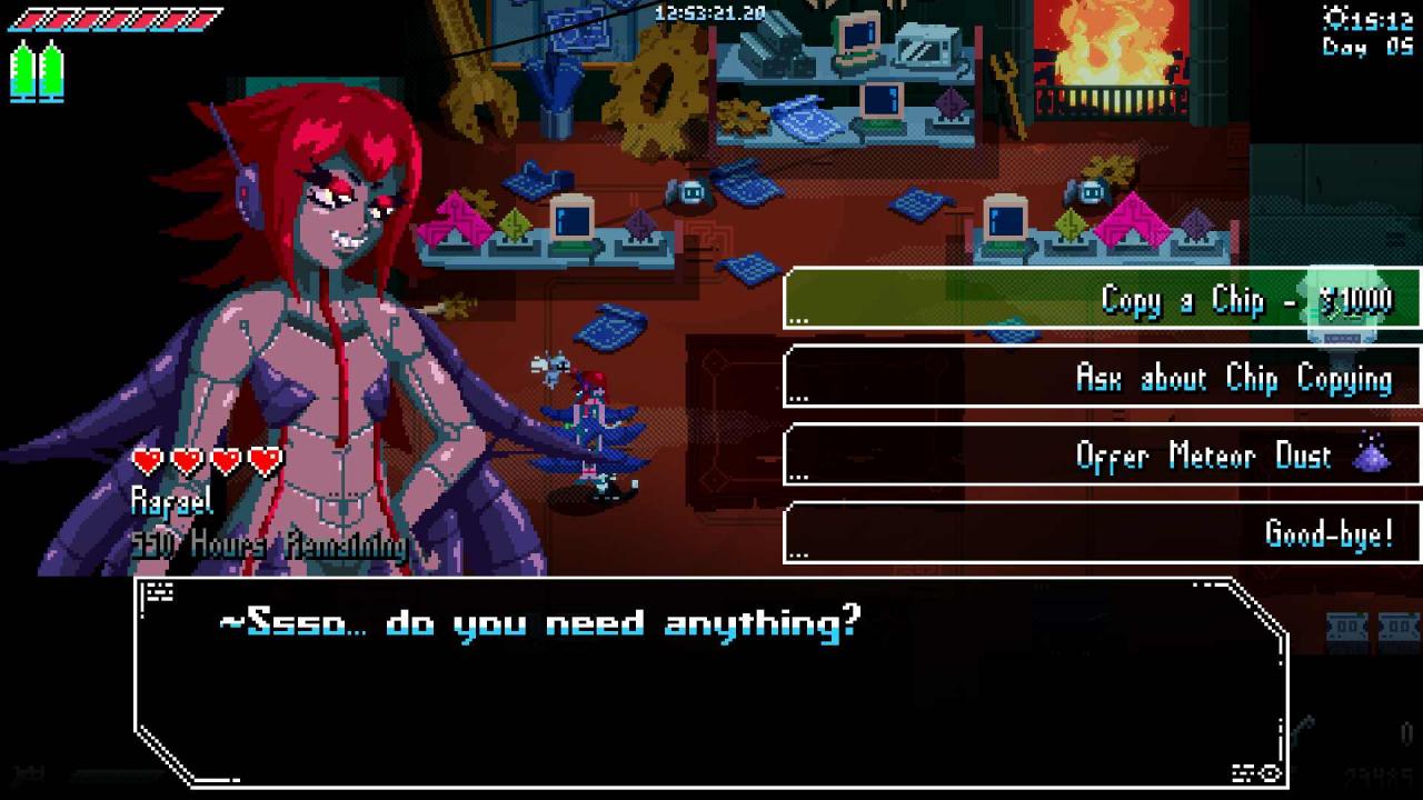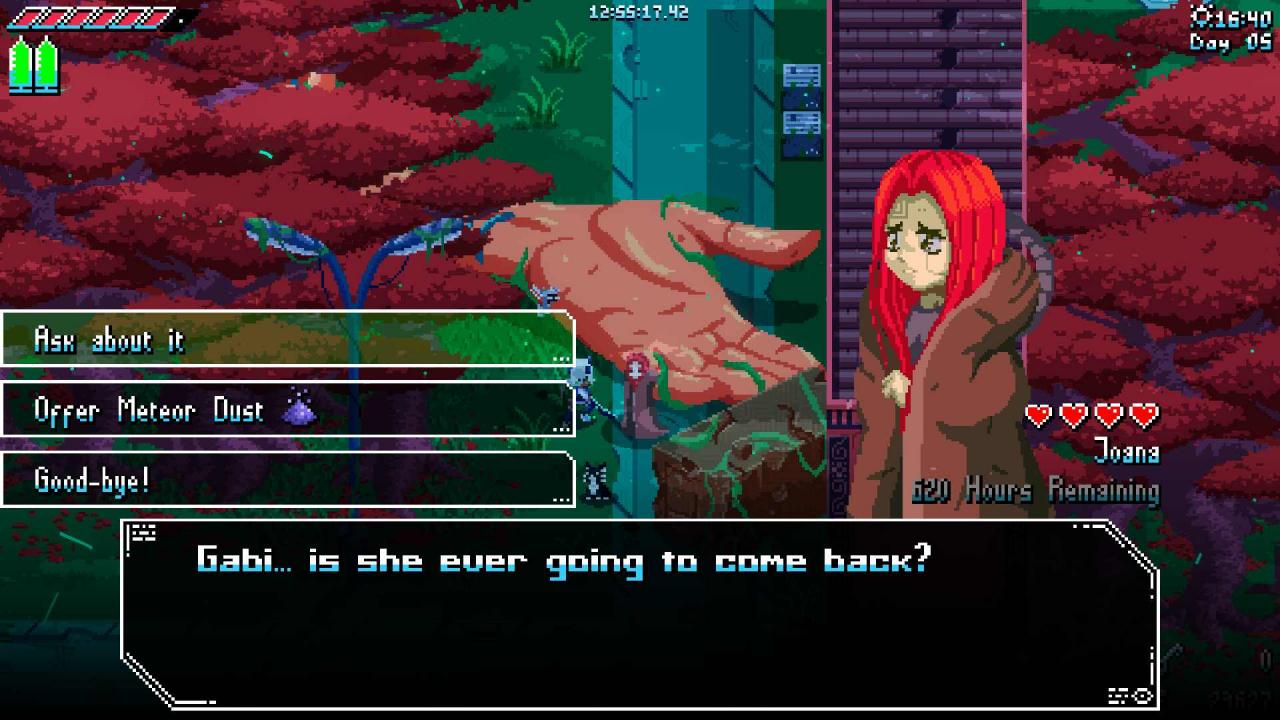 She is the first step in order to get a true ending, you have to chose her twice as a person for a time exchange. You will have to defeat her to obtain a key card and 10 dust. She was 4 hearts after time reset in my case