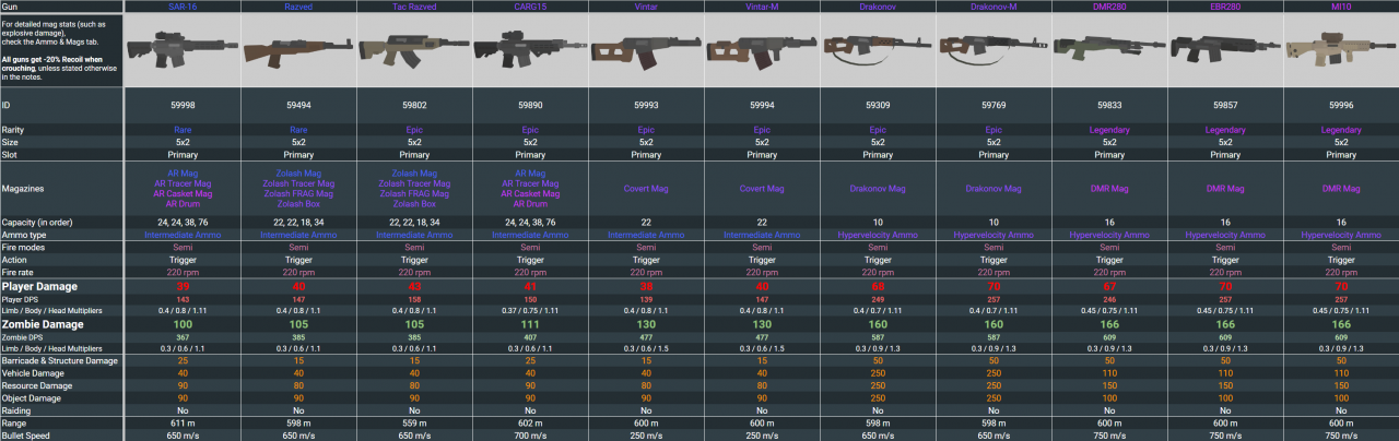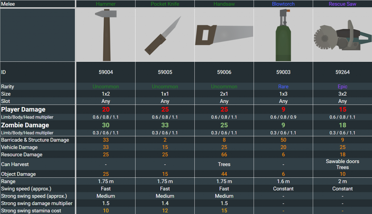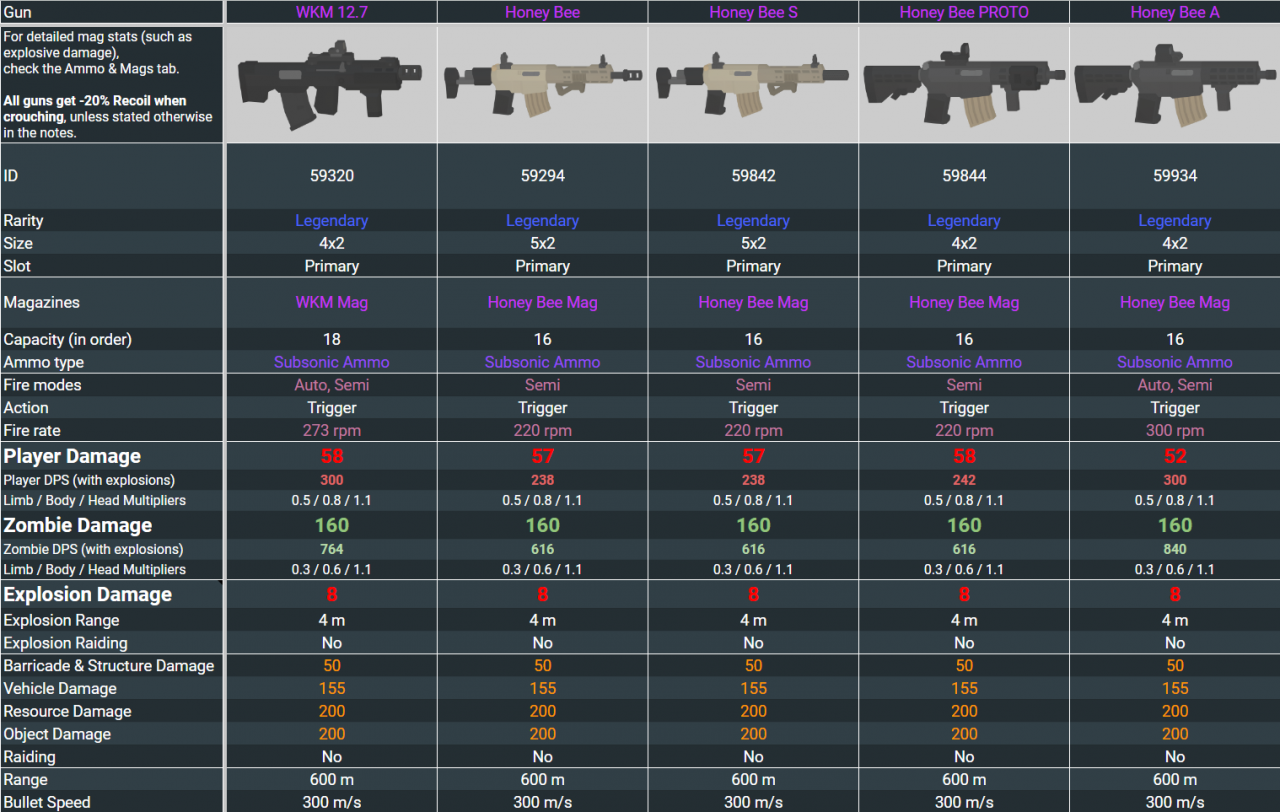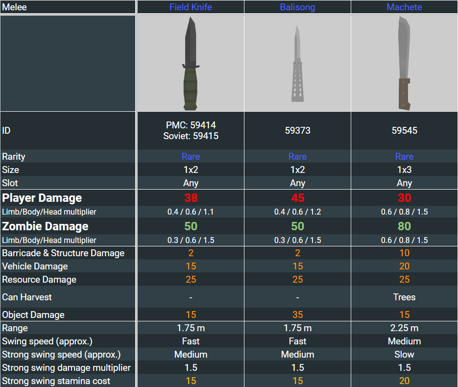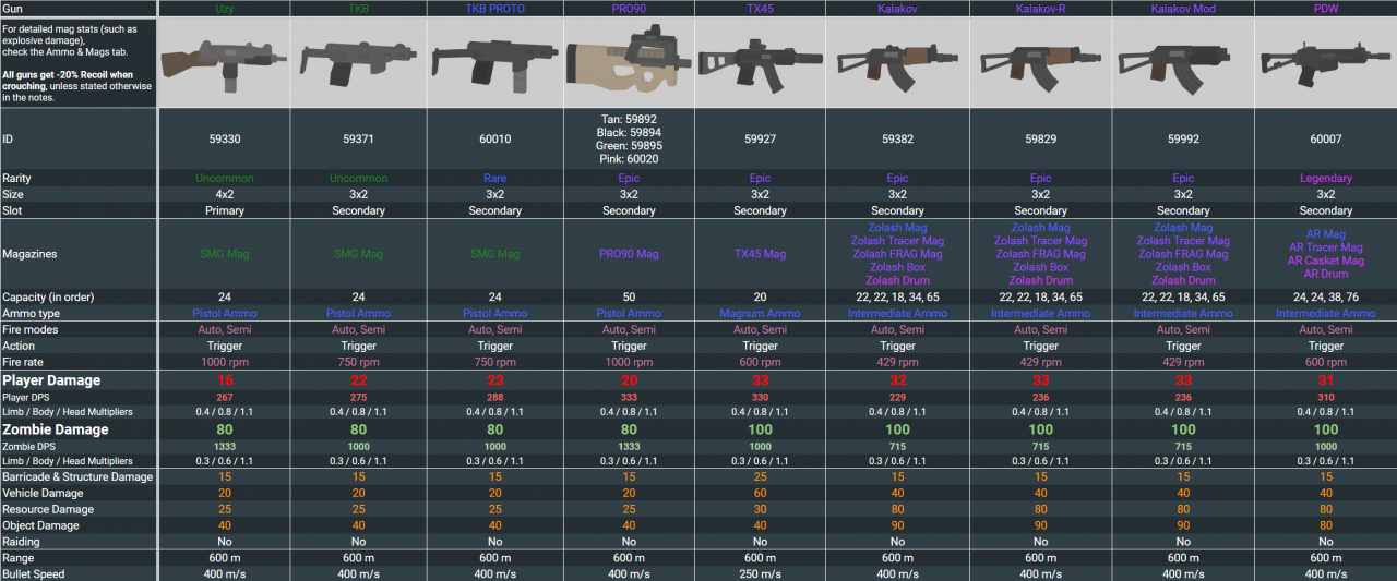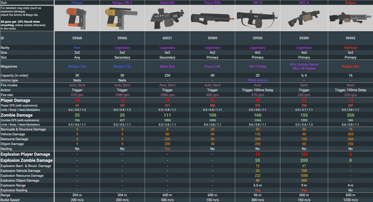 In this datasheet You can find tons of statistics about every Gun, Melee and Attachment on the Arid map. The sheet also includes info about how to obtain every one of these items (loot, craft, buy, barter).