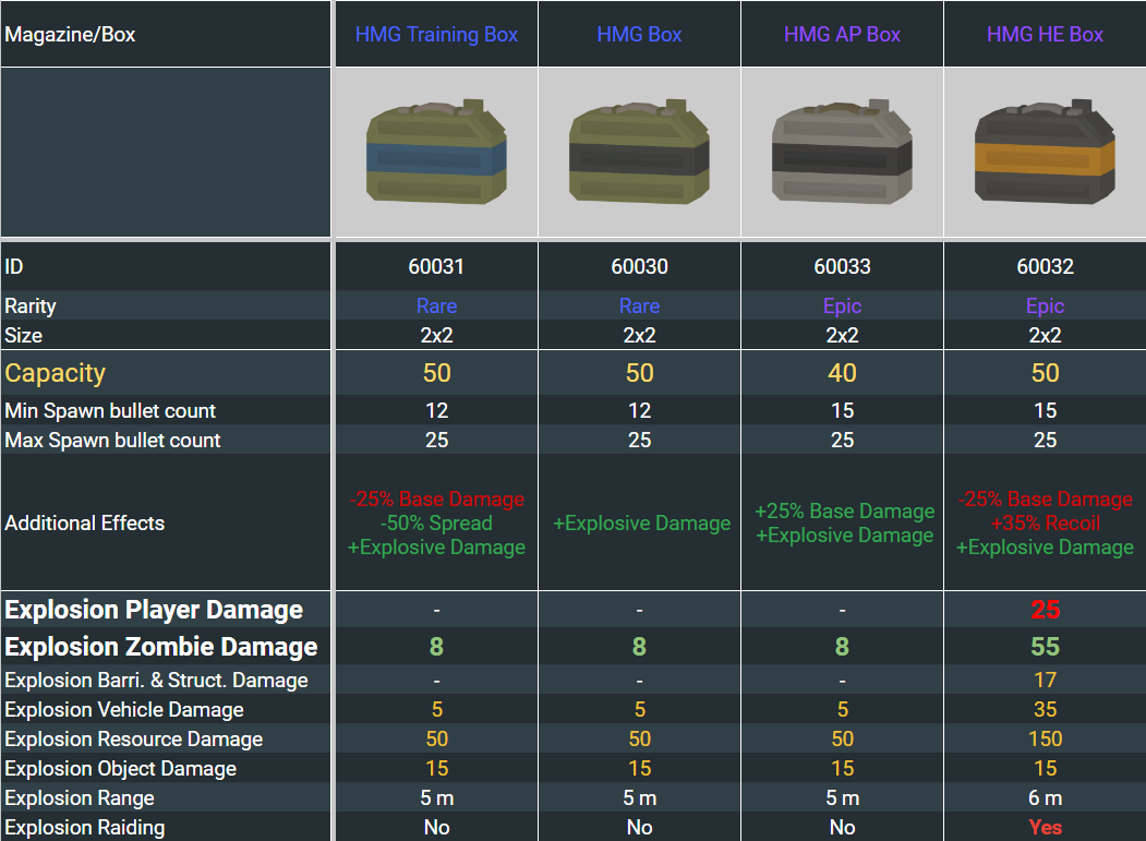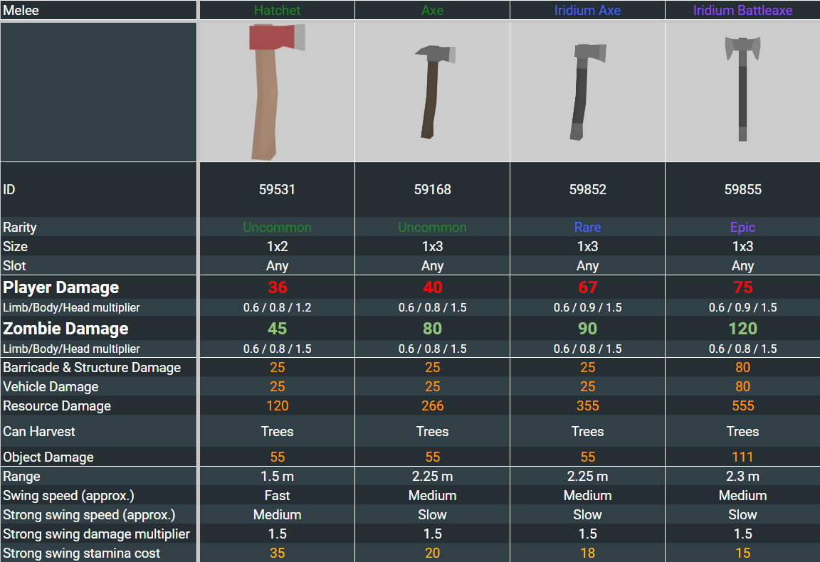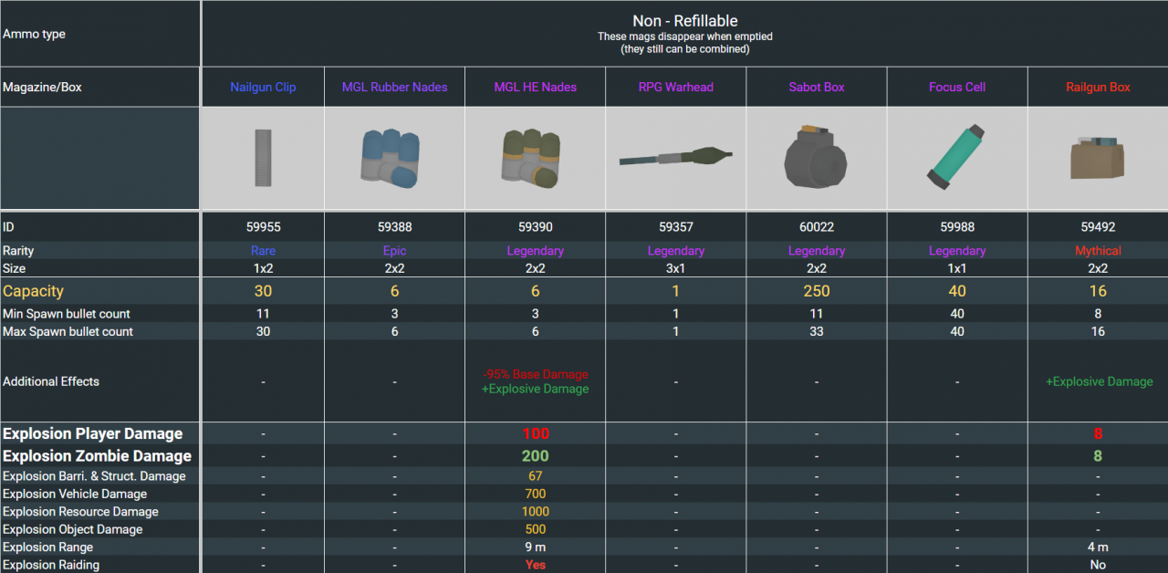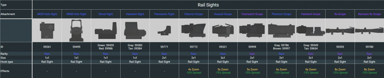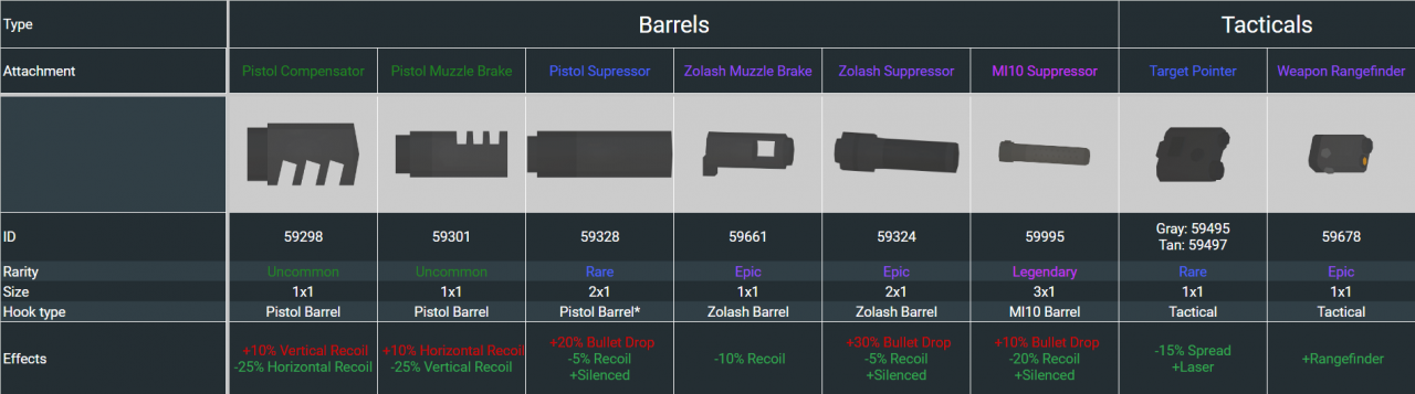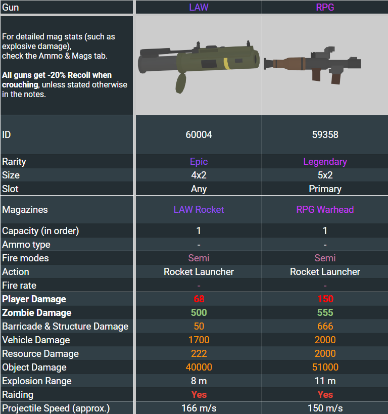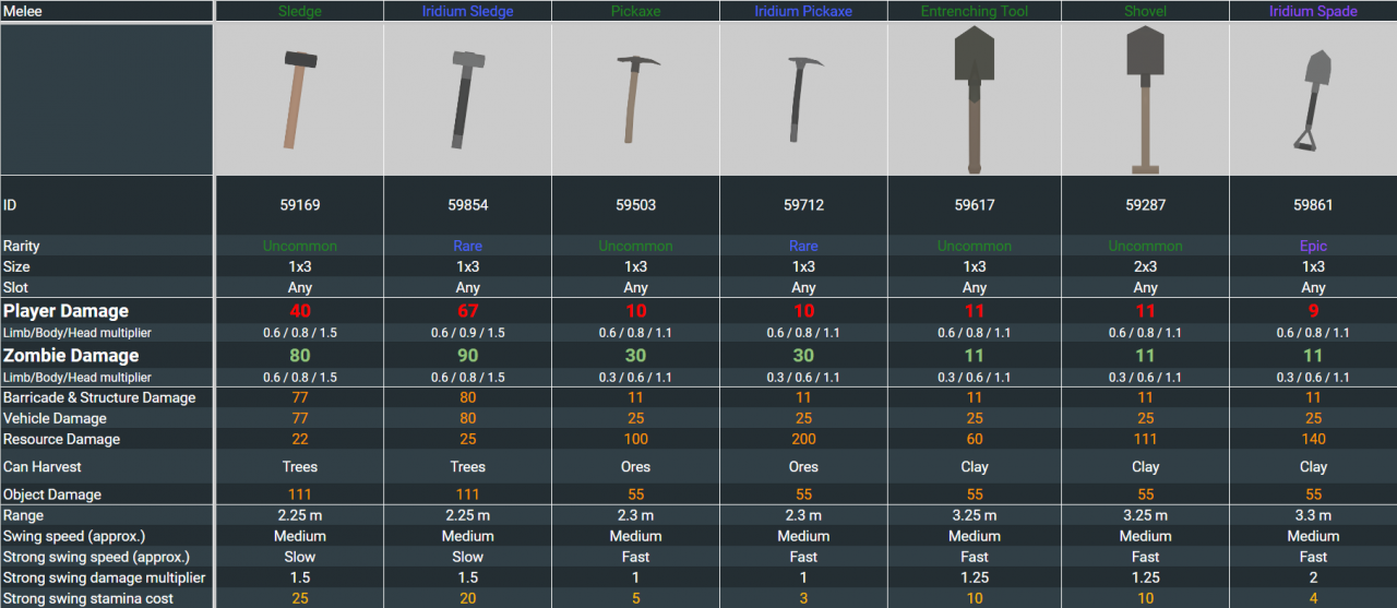 In this datasheet You can find tons of statistics about every Gun, Melee and Attachment on the Arid map. The sheet also includes info about how to obtain every one of these items (loot, craft, buy, barter).