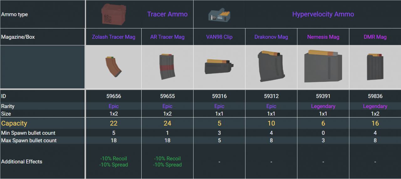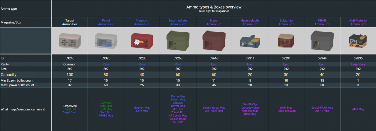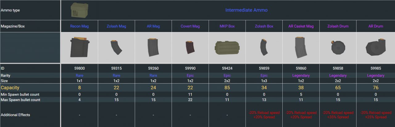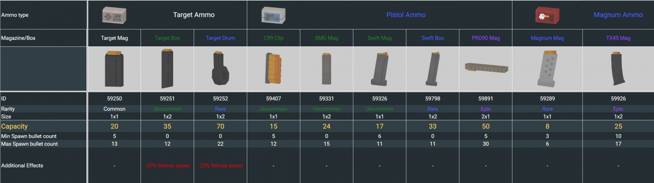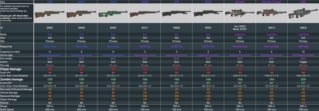 Below are screenshots of the spreadsheet, including only the basic info like damage, firerate, mags and IDs. I put them there in case someone couldn’t access the link or wanted the most basic info straight away but also so that this guide isn’t just a link to a google spreadsheet xd