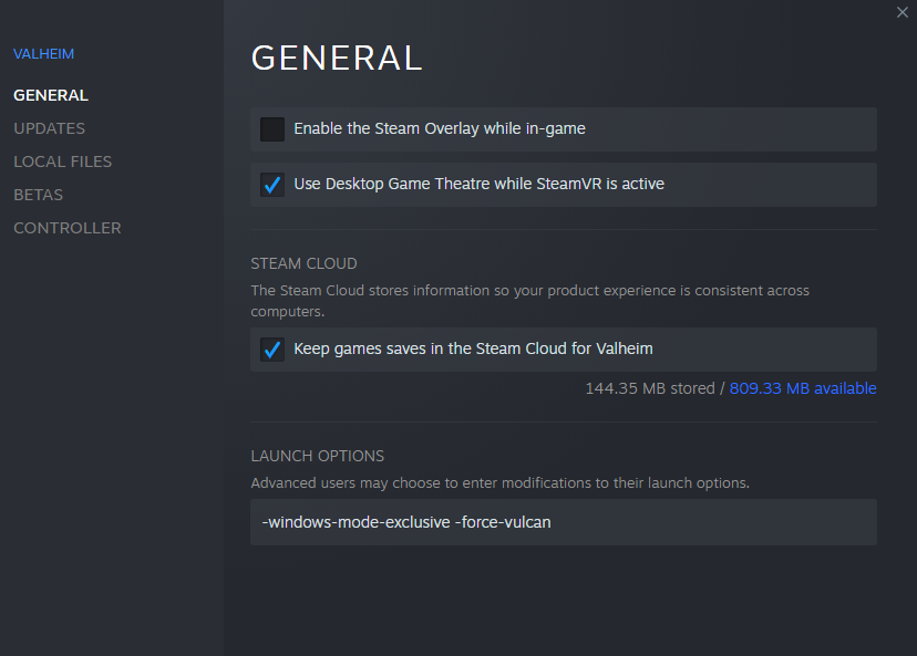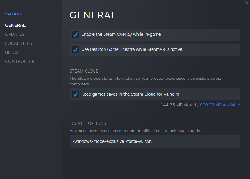 “-window-mode exclusive” (with a space) and “-force-vulcan”