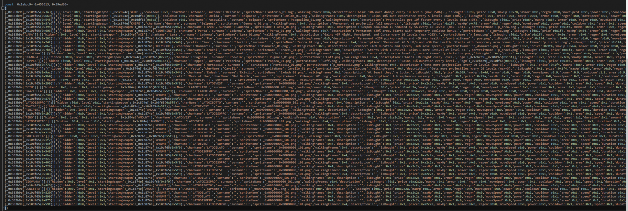 [_0x383b9e['EDIT']]:[{'level':0x1,'startingWeapon':_0x1c874e['EDIT'],'charName':'Edit','surname':'Edit','spriteName':'Edit_01.png','walkingFrames':0x4,'description':'Edit','isBought':!0x0,'price':0x309,'maxHp':0x7f,'armor':0x1,'regen':0x0,'moveSpeed':0x1,'power':0x1,'cooldown':0x1,'area':0x1,'speed':0x1,'duration':0x1,'amount':0x0,'luck':0x1,'growth':0x1,'greed':0x1,'curse':0x1,'magnet':0x1,'revivals':0x0,'rerolls':0x0,'skips':0x0,'banish':0x0,'showcase':[]},{other}],