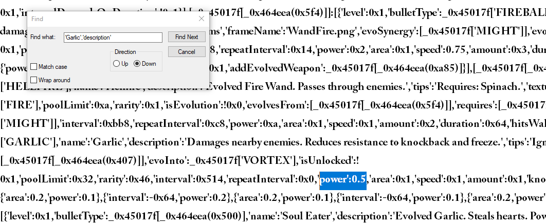 Go to Steam > Library > Right Click Vampire Survivors > manage >Browse local files > Resources > App > .webpack > Renderer > main.bundle, right click on it and edit it using Notepad then enter Control+F and search ‘Garlic’,’description’ (save the original file somewhere)
