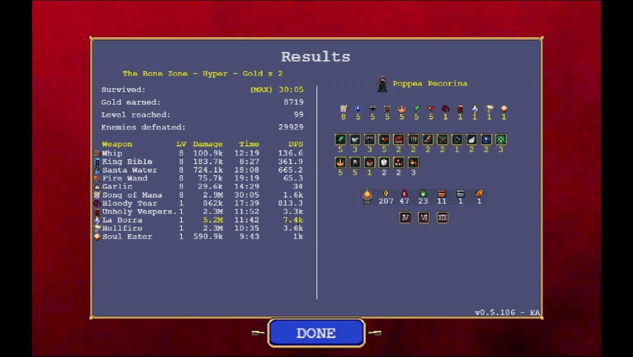 In this specific stage, there is no items drops, beside the gold, because of that you need a weapon that heal you asap! i choose to have the whip and garlic, both evolved, you can pick the arcana “Sarabande of Healing” and buff all you healing weapons, also i pick the arcana “Awake” as first arcana pick, the extra revivals are going to save you in the last part of the game if you get surrounded. I avoid the extra curse from Skull O’Maniac, but if you feel confident, you can go for it and evolve Song of mana.For the weapons i use: Song of mana (default weapon), Whip, King bible, Santa water, Fire wand and Garlic.