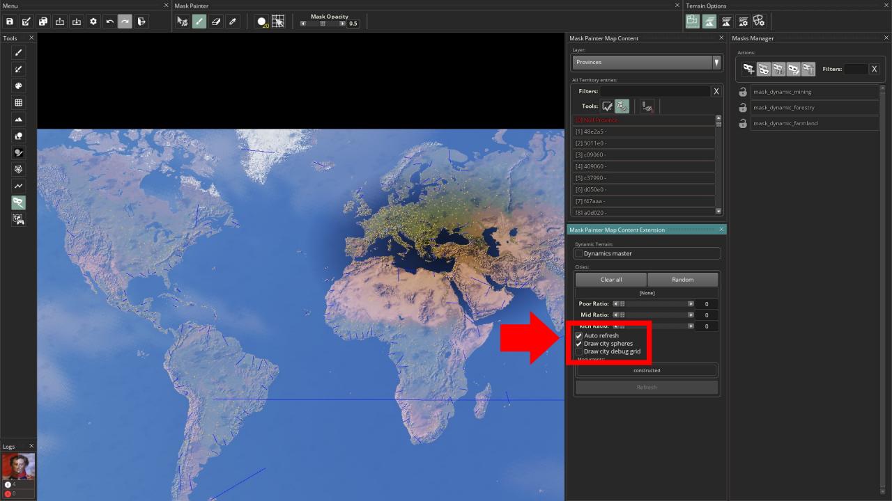 Then in the menu that it opens on the right, look at the bottom-left window and tick the two boxes circled in red: Autorefresh and Draw City Spheres.