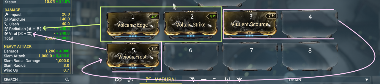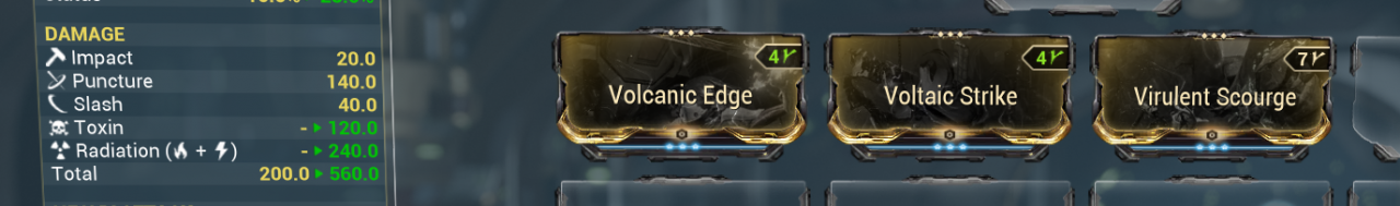 In this example, we have Heat and Electricity in slots 1 and 2, and Cold and Toxin in slots 3 and 5 (on the next row). Starting from the top-left, heat is applied. In the second slot, electricity is found and will then combine with the existing heat to form Radiation. The next mod found is a Toxic mod, which then goes on to combine with the Cold damage mod on the next row in slot 5, creating Viral. Any extra damage mods would just combine with the existing damage types.