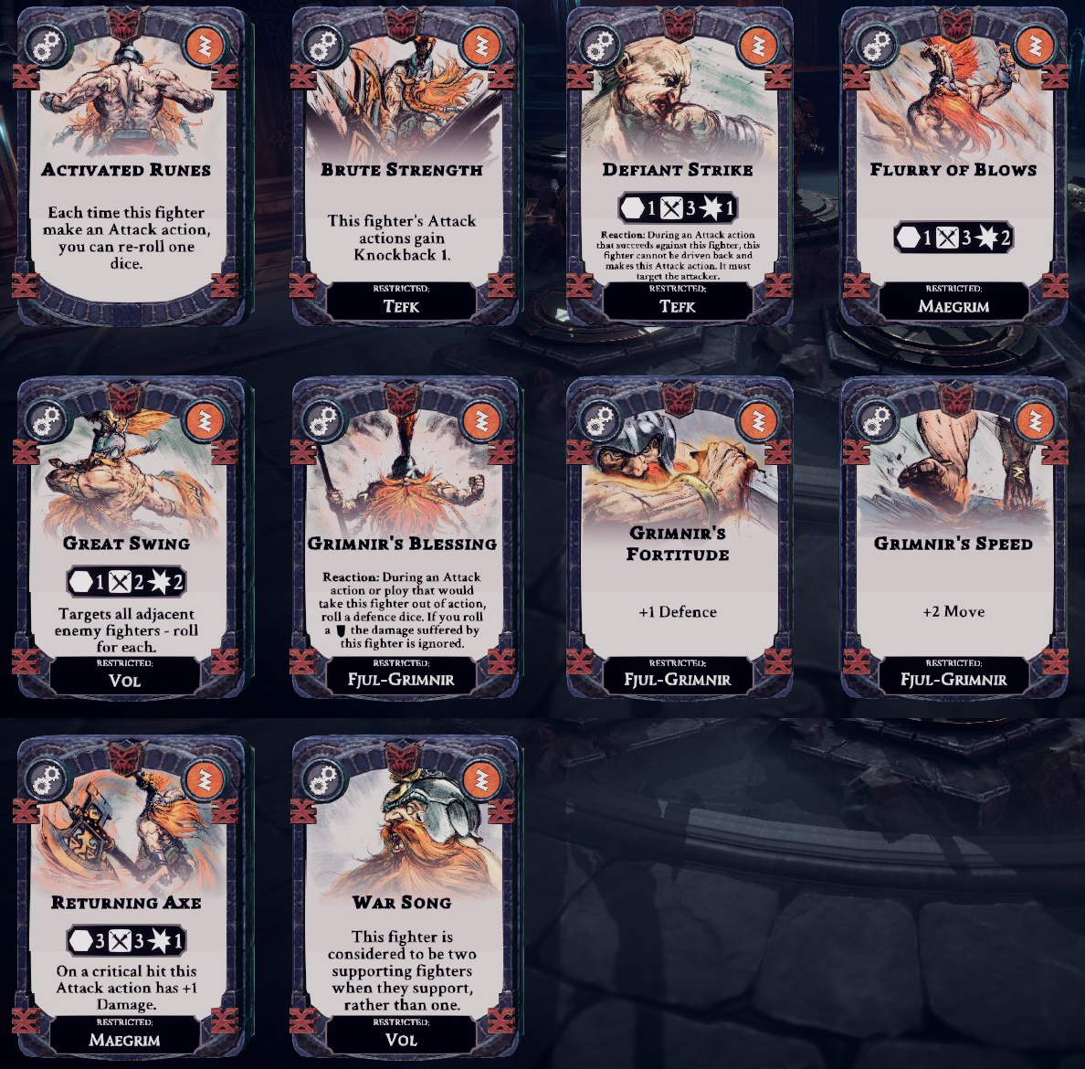 It is possible (as well as very cool and thematic) to build a deck purely around your leader. Fjul-Grimnir is one of the most powerful combat characters in the game, capable of going toe-to-toe with any other warrior (especially once he’s Inspired and has some upgrades on him), but don’t forget about the other fighters too – he’ll be better off with some equally doughty support.