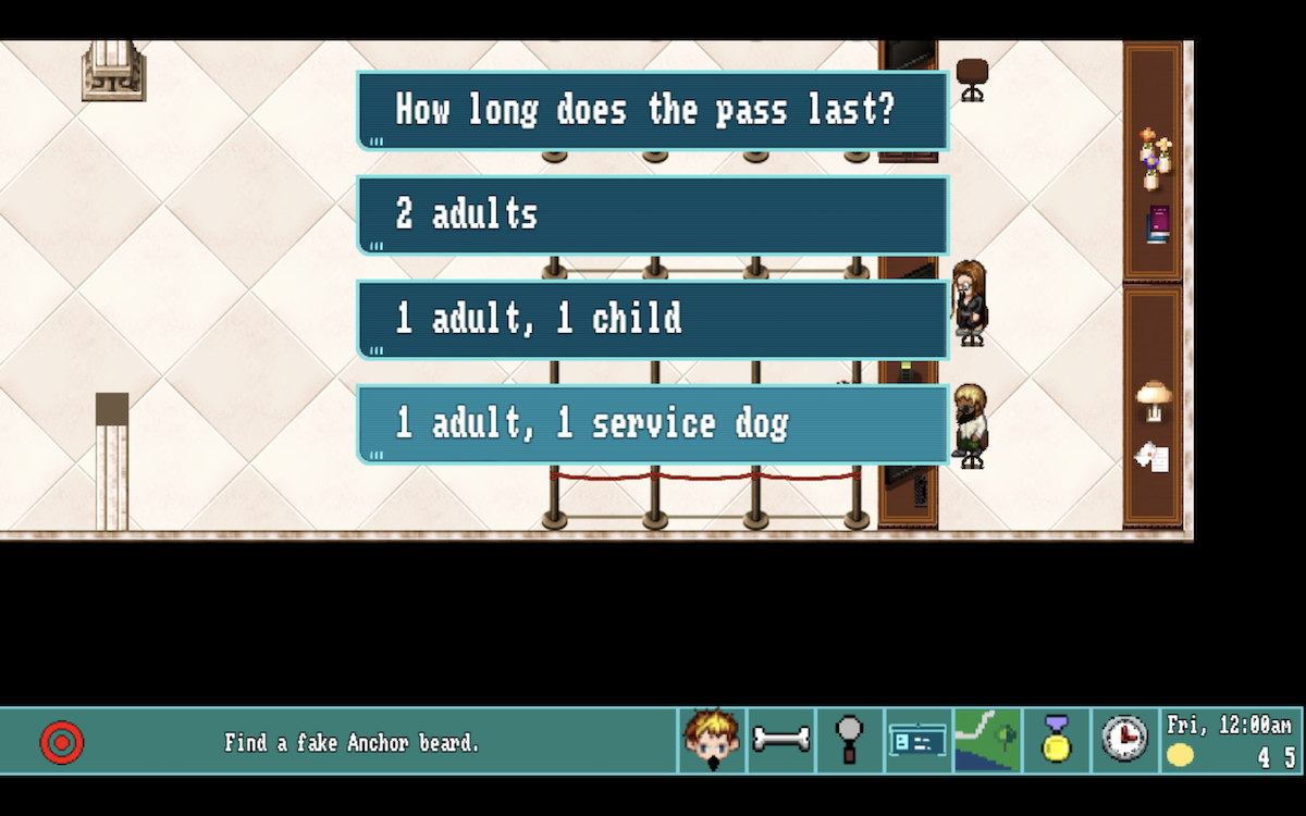 Go to the museum. Inside the museum go to the right and buy a ticket from Parker. Choose 1 adult, 1 service dog for the cheapest option of 25 credits. If you don’t have enough credits, leave the museum and walk around looking for some until you do.