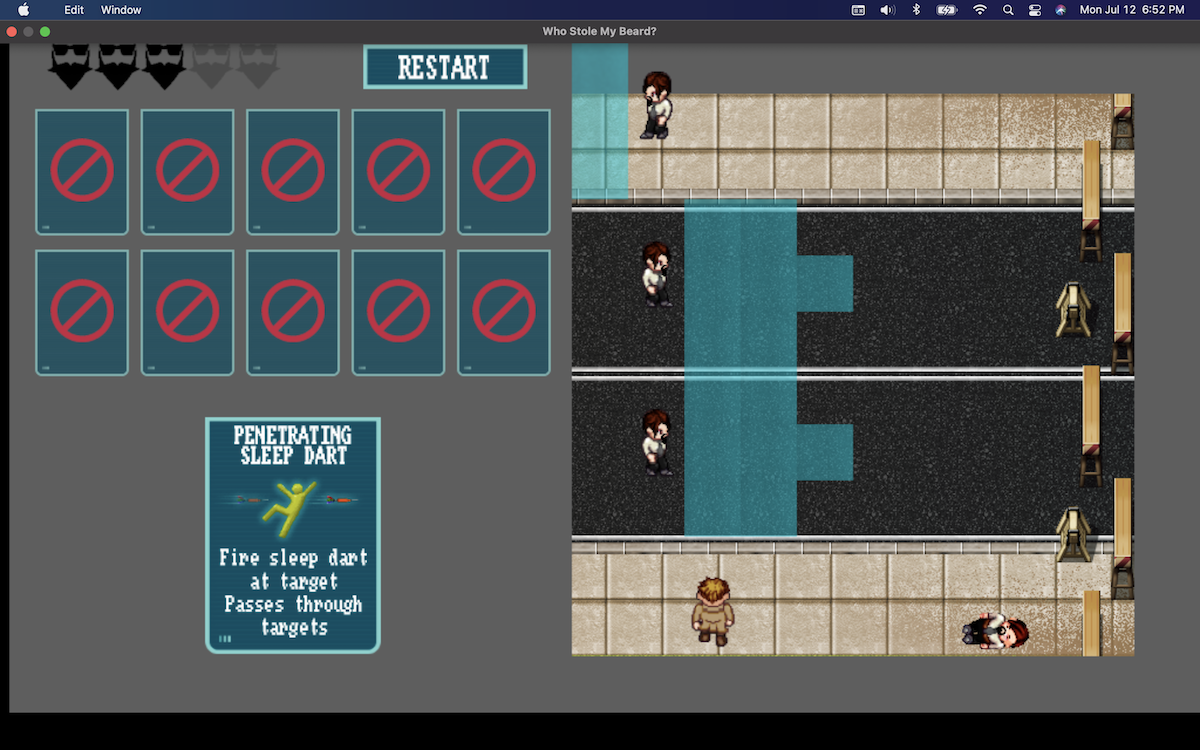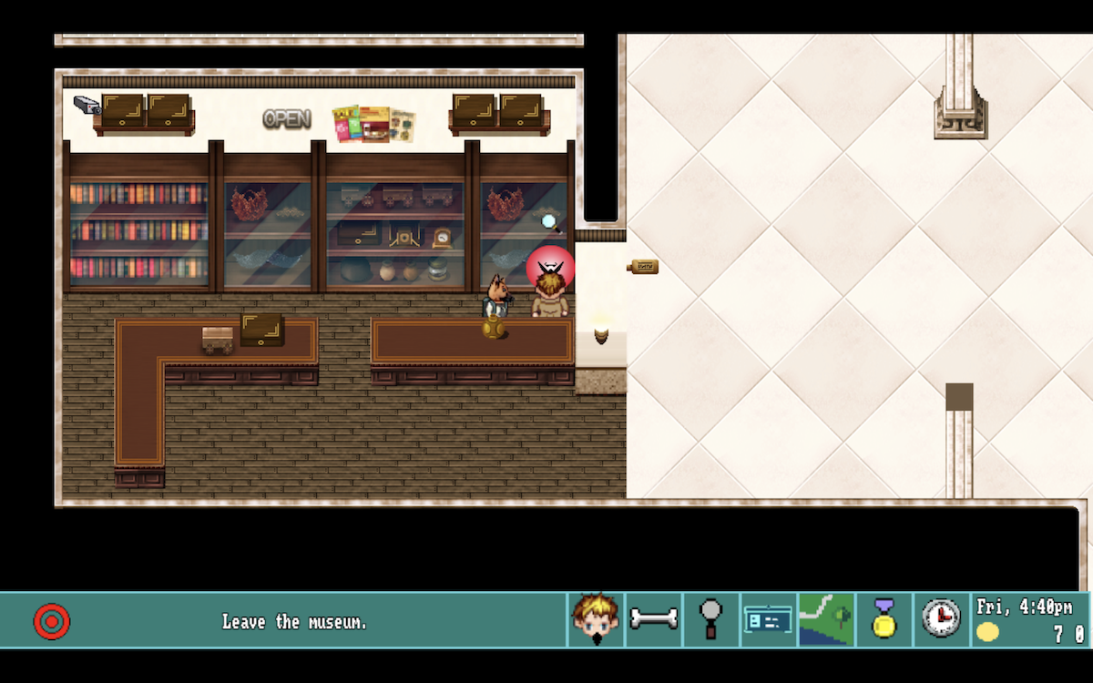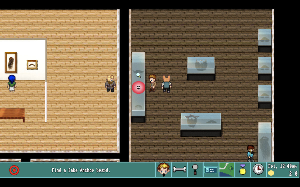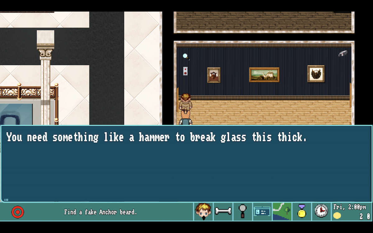 Go back downstairs to the right and sneak past into the restoration room. Pick up the hammer. Grab the 50 credits at the top left before you leave. Return to the alarm and break it with the hammer. The museum clears out, and you can go and pick up the anchor beard. Then, leave. As you leave go to the bottom right museum store and take the verdi style beard in the display case.