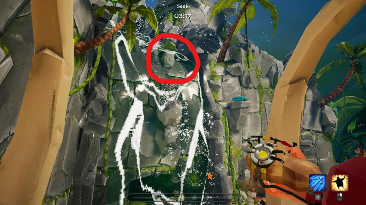 To reach this prop, you’ll want to go through the portal at the end of the small stream — follow the water flow from the waterfall itself to find it. Make sure you enter the portal slowly, otherwise it might toss you right off the top of the waterfall!