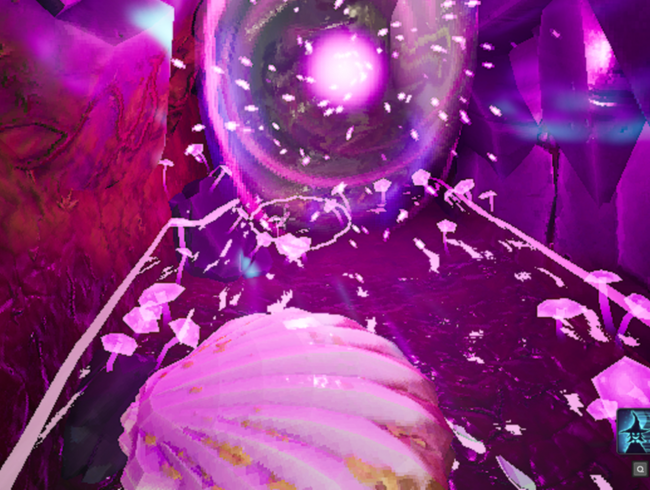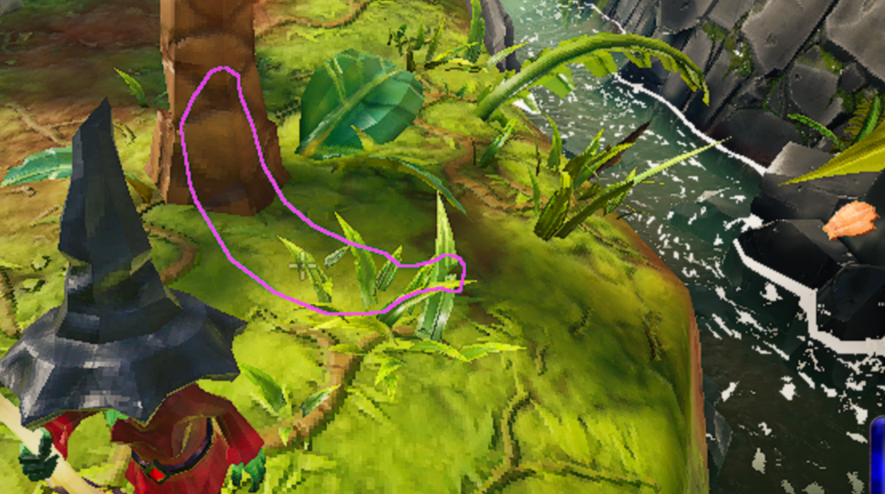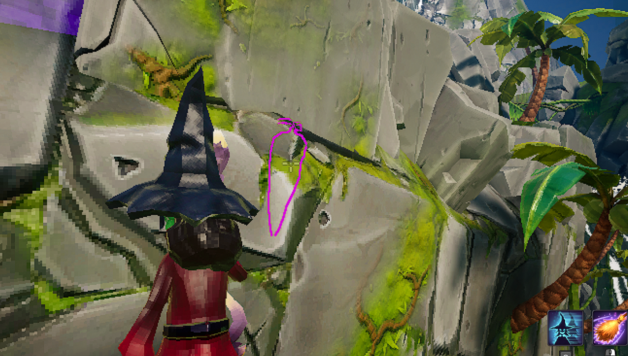 You’ll want to follow the river, facing the direction the water is flowing in. You’ll notice on your left, there are a few grey rocks — a little ways before you reach the purple portal at the end of the river, you’ll want to face left and look for these specific rocks: