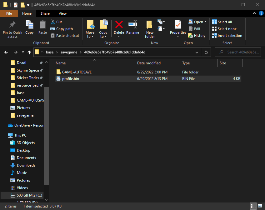 The folder highlighted above contains your save data from the Epic version. For simplicity, I will call it the “Epic” folder instead of the cluster of numbers and letters. Steam uses the same folders generated by the Epic version until the savegame folder. This is where Steam expects to access the GAME-AUTOSAVE folder as will as the profile.bin file. Steam can’t read the “Epic” folder, so it creates a new GAME-AUTOSAVE folder and profile.bin file here.