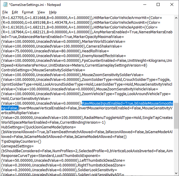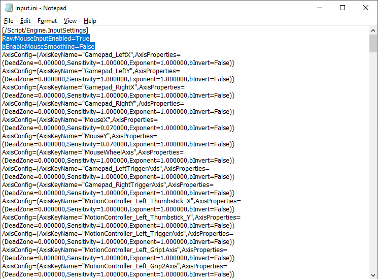 When you have that, change the False to True, behind that add a “,” and add “bEnableMouseSmoothing=False“.