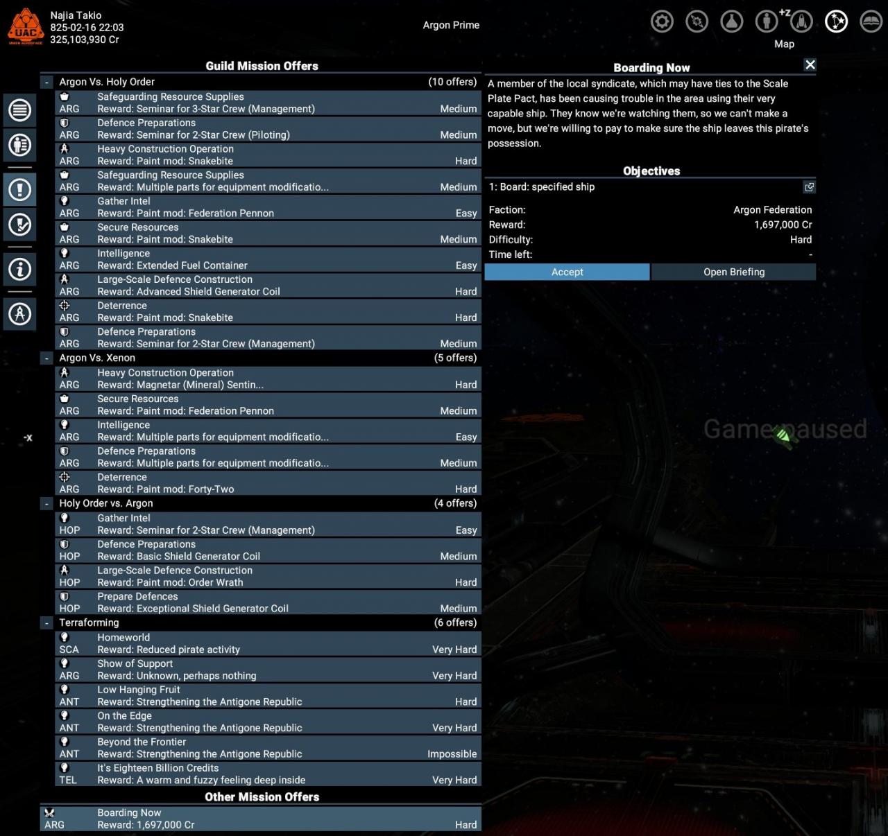 You will have quite a few story missions at once. You can also have any number of “other” missions at the same time. However, you can only have one guild mission going per guild. So, if you have already accepted one mission to fight the Xenon from the Argons and another mission to deliver a trade ship to the Teladi trade guild, then you take another mission to fight the Xenon from the Argons, you’ll find your previous mission for the Argons has vanished. The Teladi mission won’t be affected at all. Also, when you accept a guild mission, all other missions from that guild in the sector immediately expire, so you can’t go through the list of missions and accept/abort until you find the mission you like best.