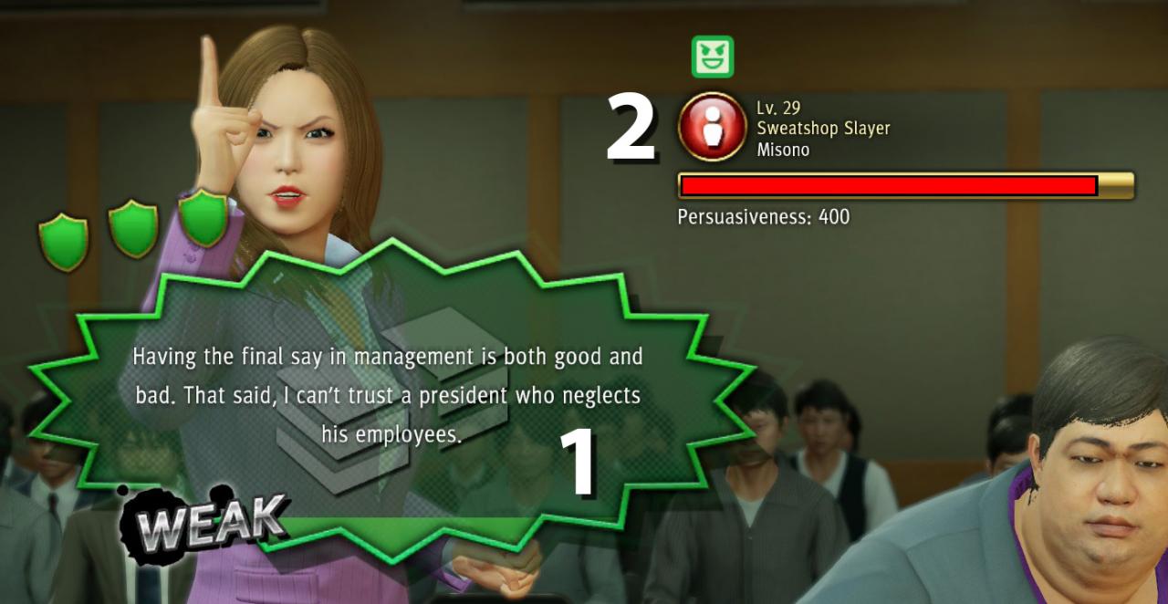 The strategy is to first look at the argument colour, and select your attack colour. Then look at the the enemy’s colour, and select your attack colour to start doing damage. It’s that simple.Bear in mind you have a limited time to attack their argument before you do damage, so select quickly.