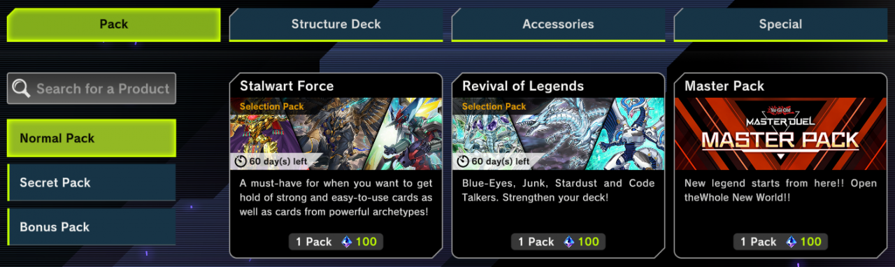 There’s three Normal Packs available in the Shop: Two timed ones and the Master PackNever buy from the Master Pack, since it has every single card available and it’s practically impossible to get what you want.