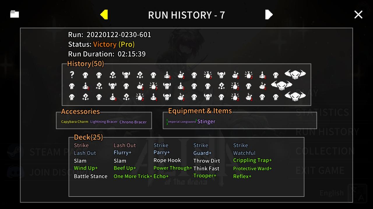 This deck had difficulty with scaling – it was sometimes difficult to get my powers active while also kiting attacks, and even if I could manage that, it put me behind in scaling my offense. I ended up taking a lot of damage during this run, but since I was avoiding defense scaling, that is to be expected. It does show that it is possible to build viable skirmisher decks, but given that enemies start to gain AoEs and unavoidable attacks by the end game, it will always be a more risky style of play than stacking block.